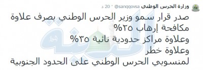 ٢٥% علاوة مكافحة إرهاب و ٣٥% علاوة “نأي” لمنسوبي الحرس الوطني