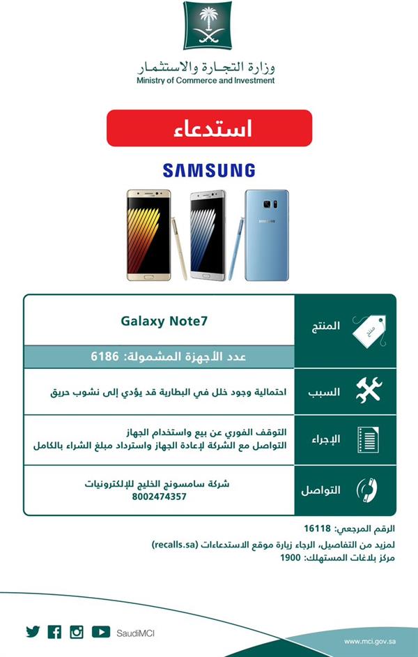 “التجارة” تدعو للتوقف الفوري عن بيع واستخدام جوال “جالكسي نوت7”