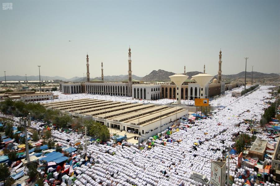 بالصور.. مشاهد مهيبة للحجاج أثناء صلاتي الظهر والعصر بمسجد نمرة