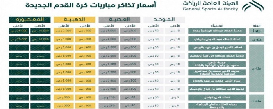 هيئة الرياضة تخفض قيمة تذاكر المنصة لفئتيها الذهبية والفضية